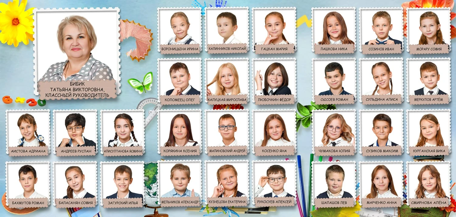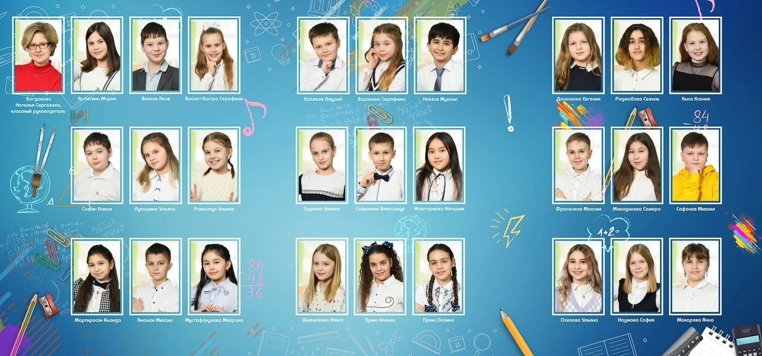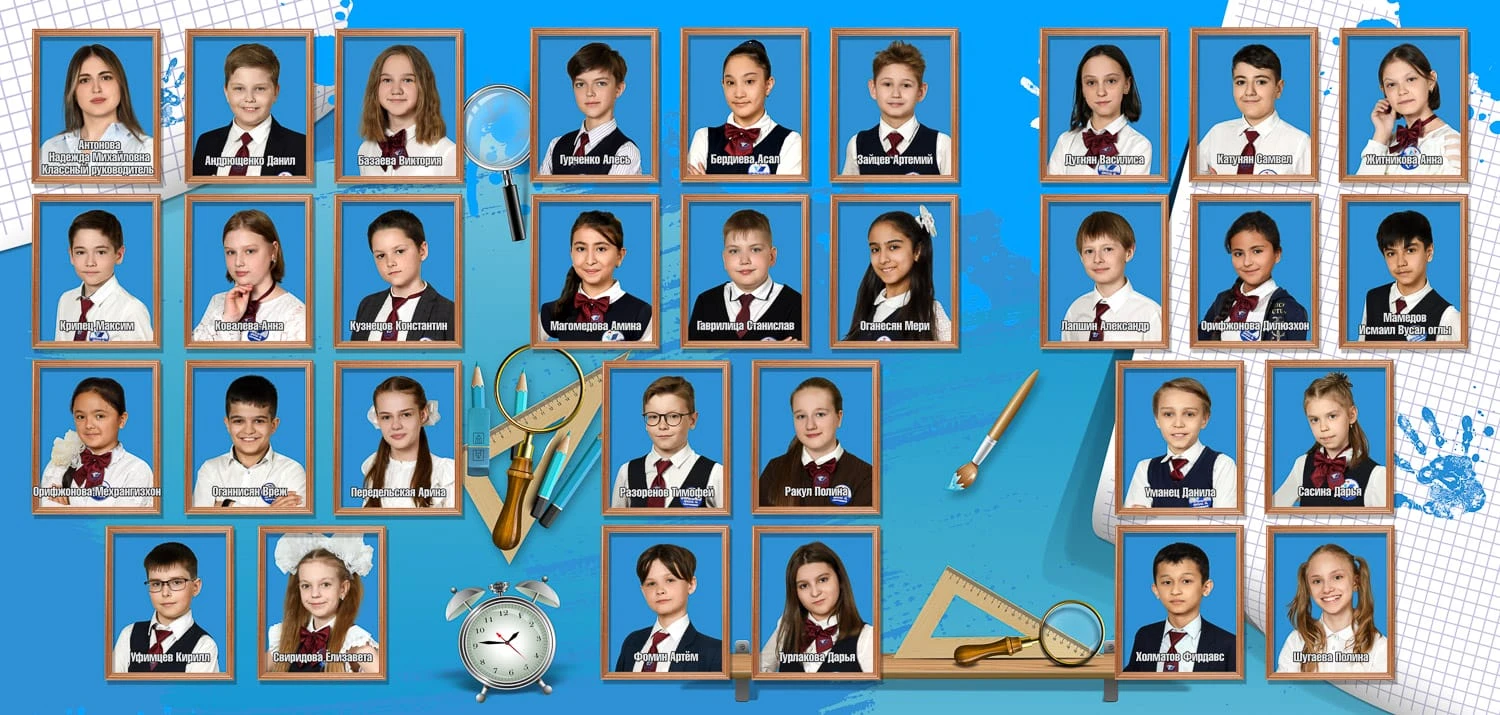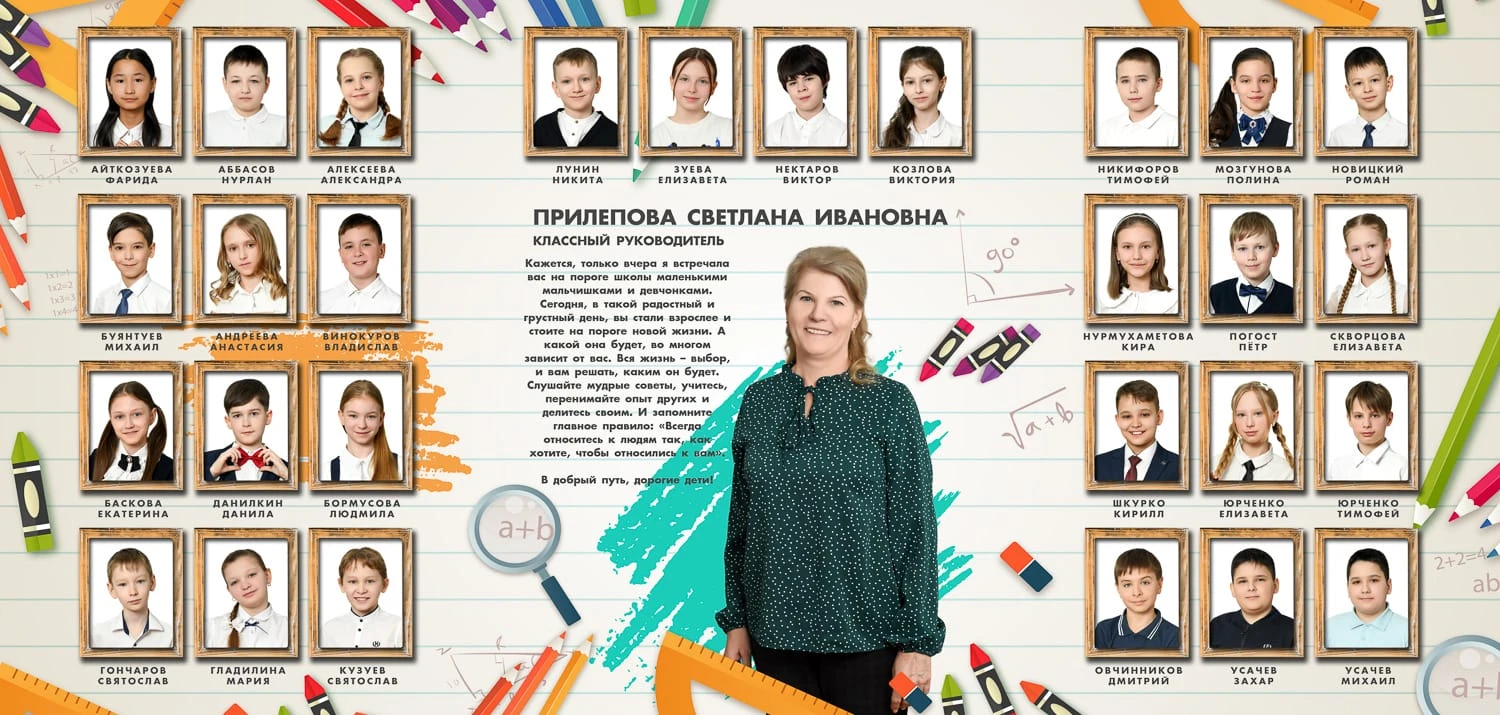 Портрет ребенка слева, справа все дети и учителя.