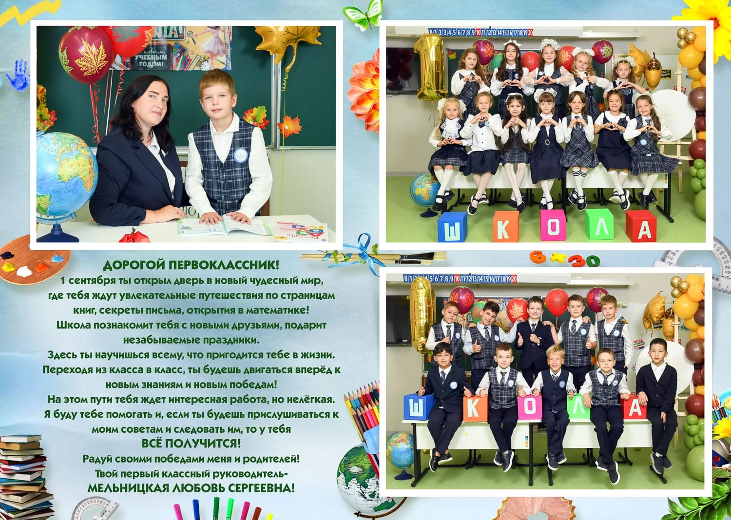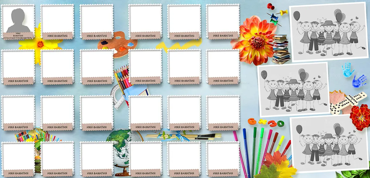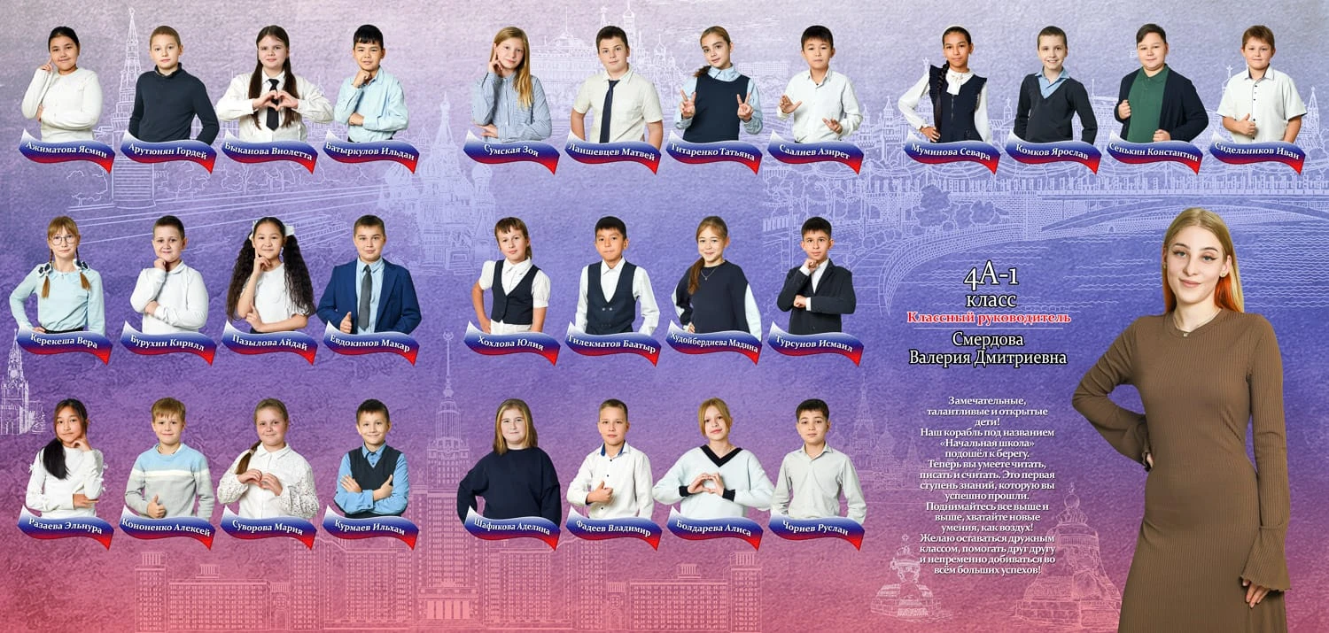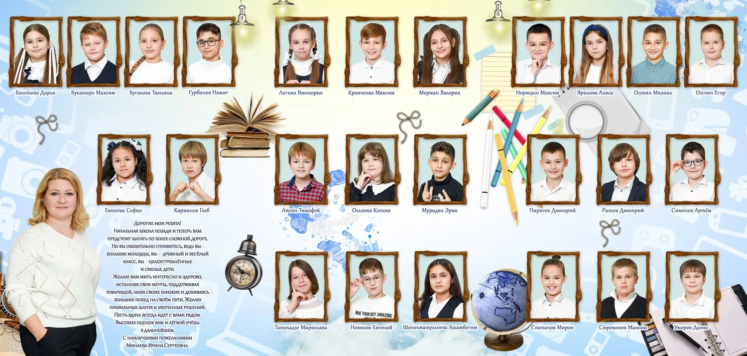 Портрет ребенка слева, справа все дети и учителя.