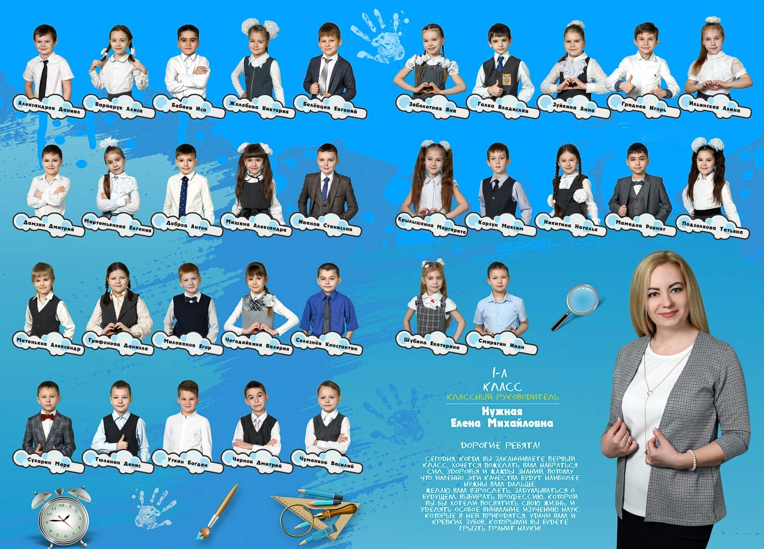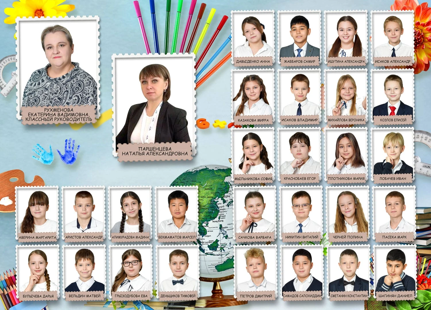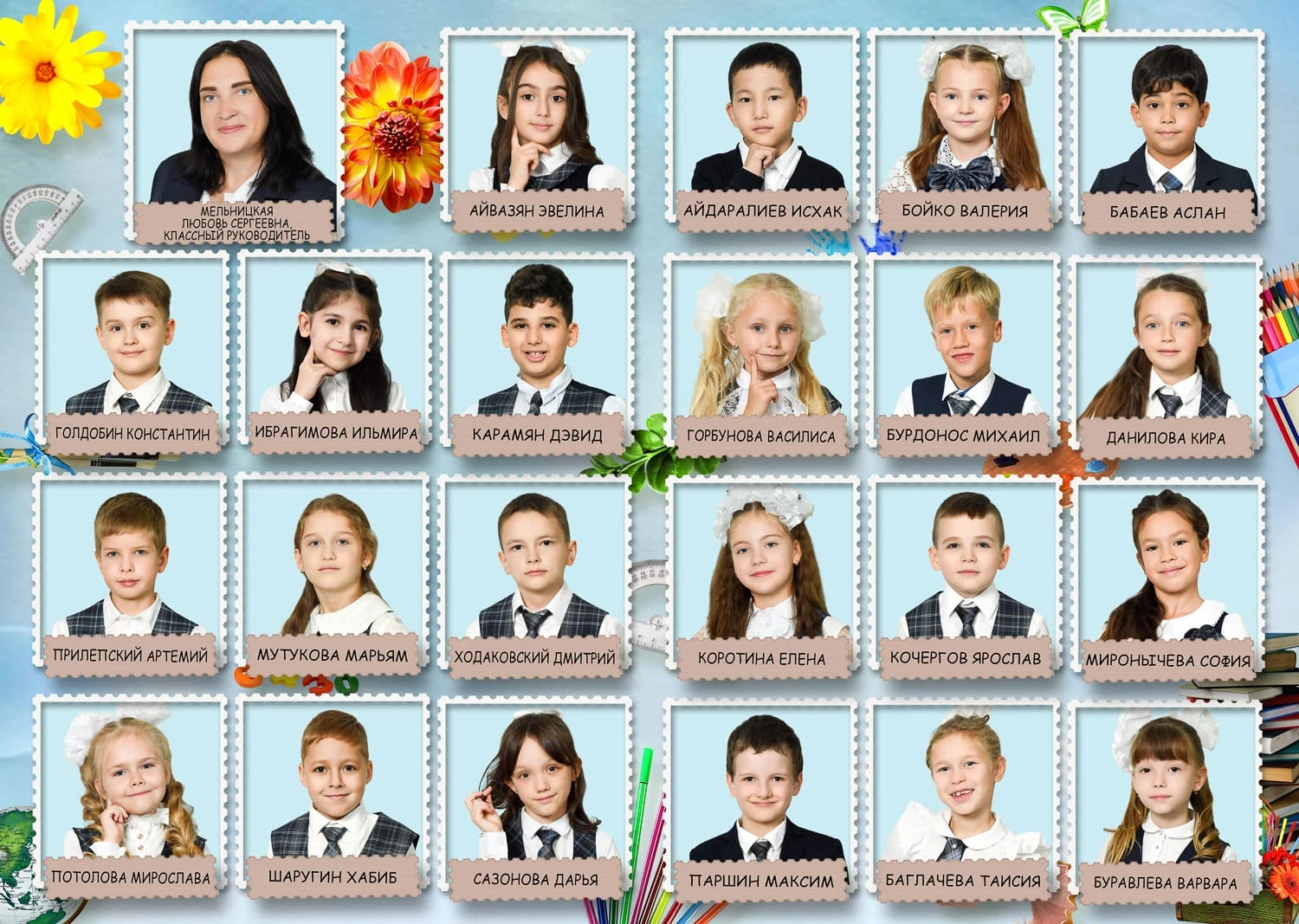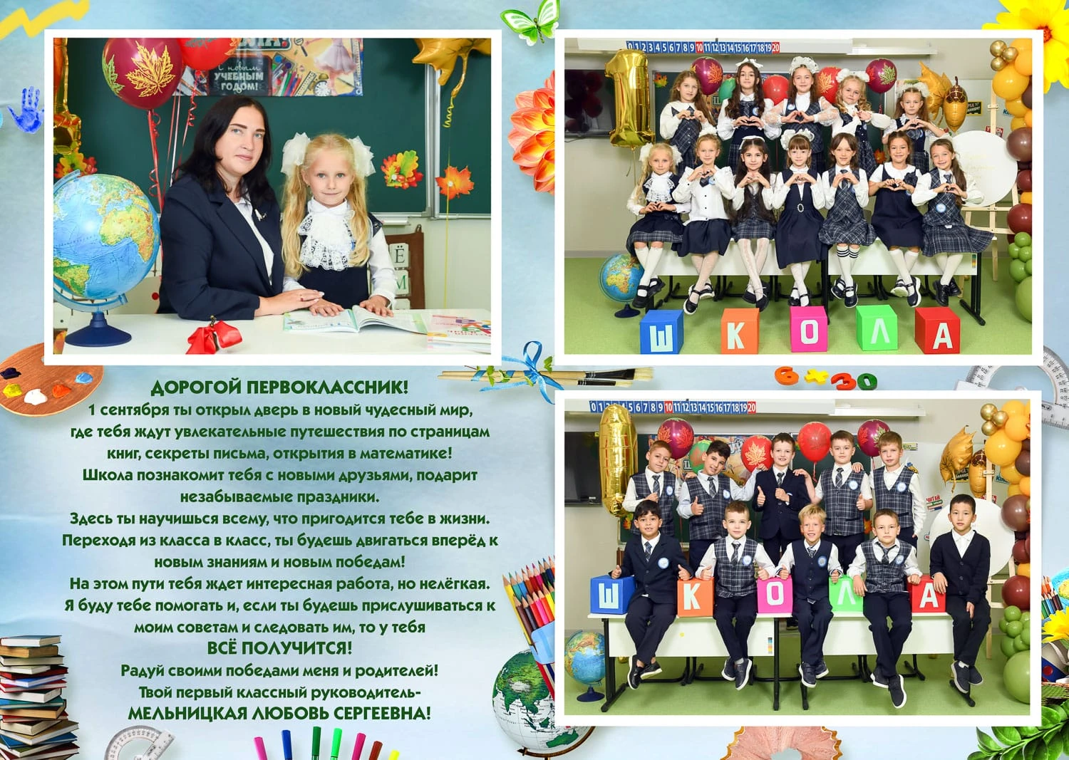 Портрет ребенка слева, справа все дети и учителя.